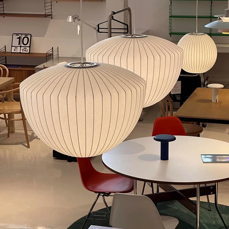 The Nordic fabric ceiling lamp combines minimalist Scandinavian design with Japanese-inspired wabi-sabi style. Its white silk shade provides a soft, even light, lending an elegant, tranquil atmosphere to living rooms, bedrooms, dining areas, and hotels.